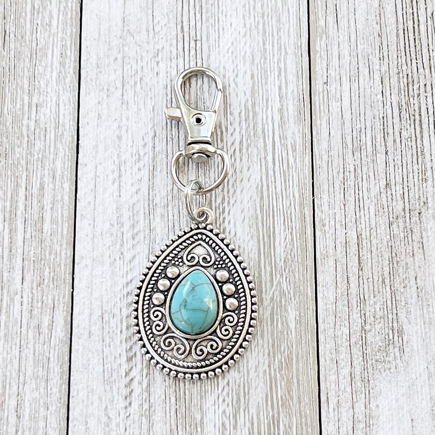 Gorgeous Large silver toned Boho Western Medallion with Faux turquoise zipper pull charm. This beautiful zipper pull is a perfect gift for Western Lovers. Accent your Jackets, purse, backpack, camera bags, luggage etc. The possibilities are endless. The Medallion is approximately 1.03 inches long. The full charm with clip measures approximately 2.82 inches in length.