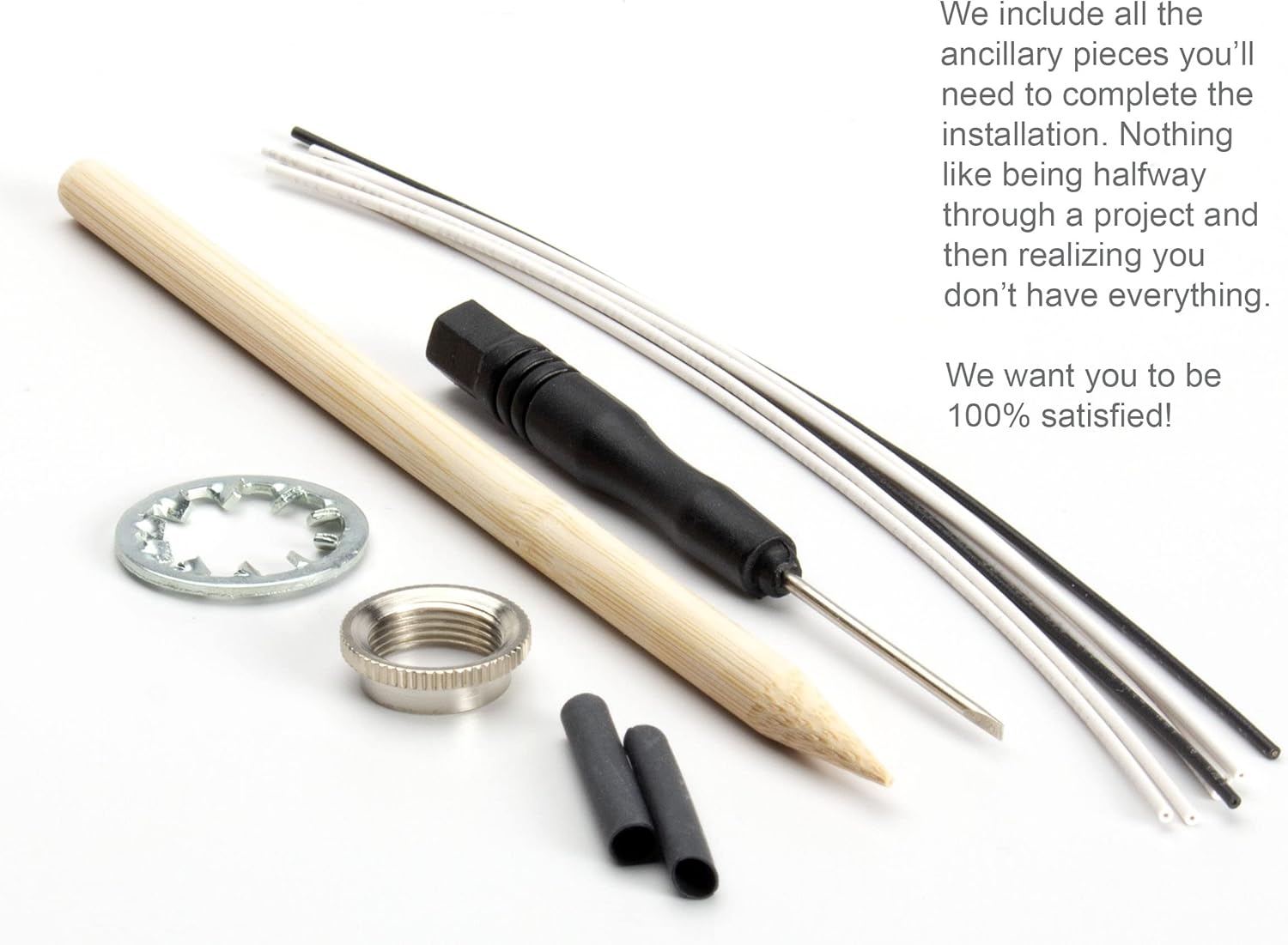Fits guitars with toggle pickup selector, will not work with SE guitars that use a lever (Fender-style) pickup selector.PRS SE guitars are crying out for better electronics. Inherently good guitars, at a very reasonable price point, these guitars are compromised by their base-level electronic components. When coupled with good pickups with 4-conductor leads, our wiring kits provide substantial improvement in tonal flexibility, allowing you to realize your guitar's true potential!Our wiring kit includes everything you need to do the job easily. All hardware is included, along with very clear illustrated instructions. You will need to do some soldering, but not much. We've soldered two ground wires to each of the pots for you, and the rest of the connections to the pots are made via screw-down terminals, rather than soldering. We even give you the little screwdriver you'll need! Here's what you get: (1) - CTS solder-free push/pull pot (volume control) (1) - CTS solder-free push/pull pot with built-in caps, select from 7 values (tone control) (1) - Switchcraft pickup-selector toggle switch (1) - Deep nut for above Switchcraft switch (1) - Switchcraft jack with leads pre-installed (1) - ToneShaper variable treble-bleed circuit (1) - ToneShaper solder fixture (2) - 6" black wire, 26 AWG stranded (5) - 6" white wire, 26 AWG stranded (1) - 6" PTFE sleeve to insulate bare wire on pickup leads (1) - Internal-tooth lock washer for Switchcraft toggle switch (2) - Heat-shrink tubing, for toggle-switch input lugs (1) - Mini screwdriver for push/pull screw-down terminal blocks (1) - Wooden stick with pointed end to manipulate DIP switches on tone pot