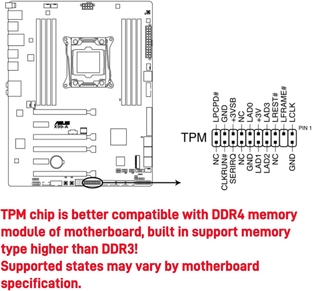 Specification: Item Type: TPM2.0 Encryption Security Module Material: PCB Compatible Device: Compatible with ASUS motherboards with 20-1 pin TPM header Pin Definition: 20-1 Pin TPM Version: TPM 2.0