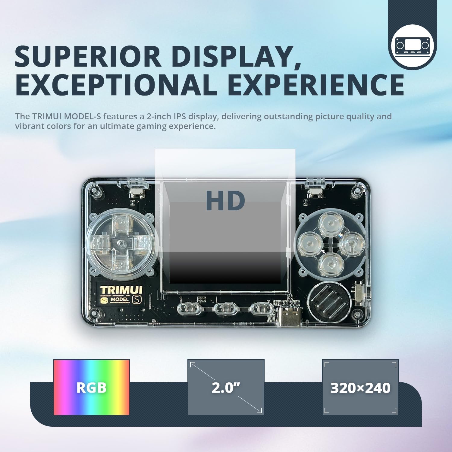 Introducing the TRIMUI Model S Mini Handheld Game Console, a retro gaming powerhouse packed into a compact 2-inch IPS screen. This metal-upgraded version boasts an ARM628 processor, delivering a smooth and immersive gaming experience. Relive the nostalgia of classic games with its retro video game console design. Portable and lightweight, it's the perfect companion for gaming on-the-go. With its sleek metal body and vibrant IPS display, the TRIMUI Model S Mini offers a premium gaming experience in the palm of your hand. Dive into a vast library of retro titles and enjoy hours of entertainment wherever you go. Embrace the past while embracing the future of handheld gaming with this remarkable console.