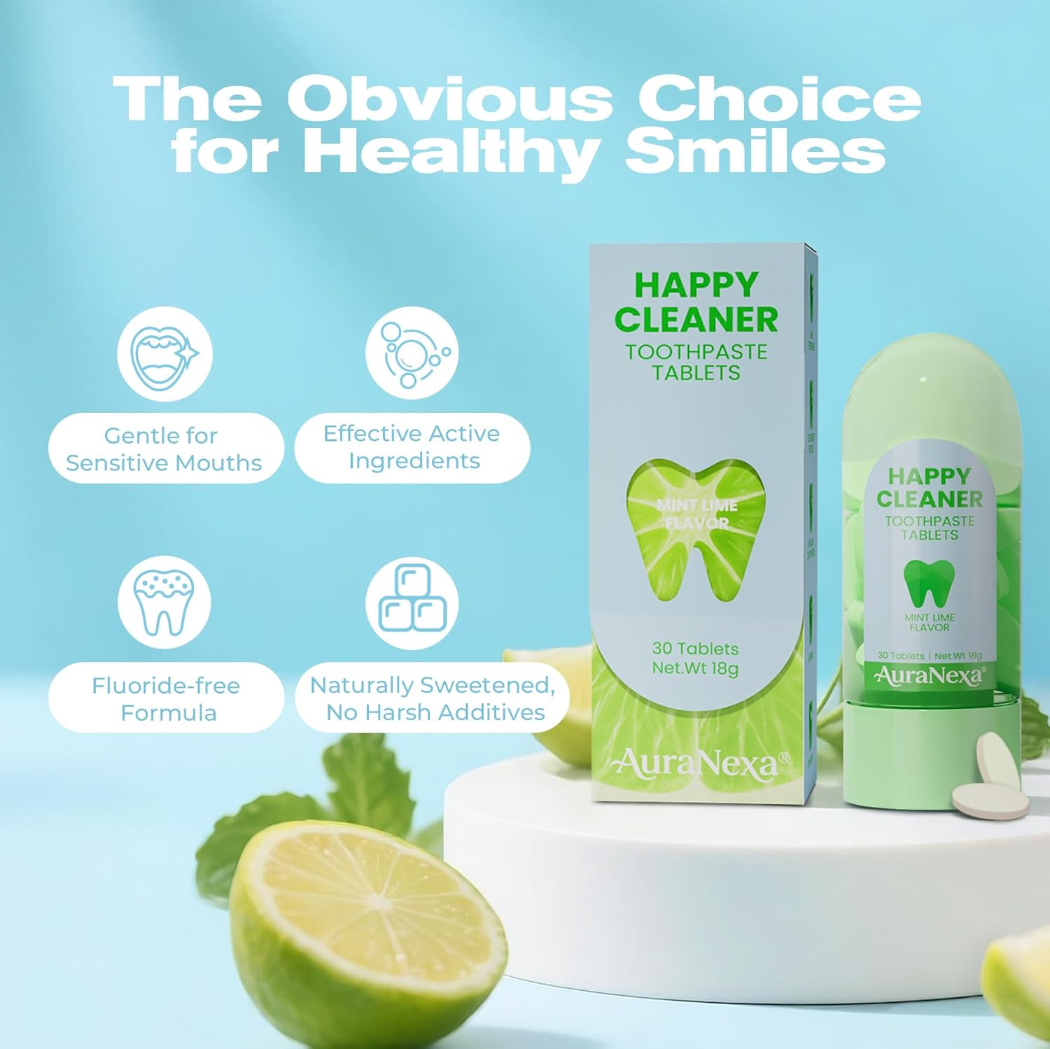 | Product Benefits | Enamel Protection, Fluoride-free chewable toothpaste for gentle daily use, Oral probiotic complex supports a clean, balanced mouth feel, Remineralizing toothpaste tablets with nano hydroxyapatite, Two refreshing flavors: lime mint and watermelon mint, Value pack with easy, mess-free solid tablets |