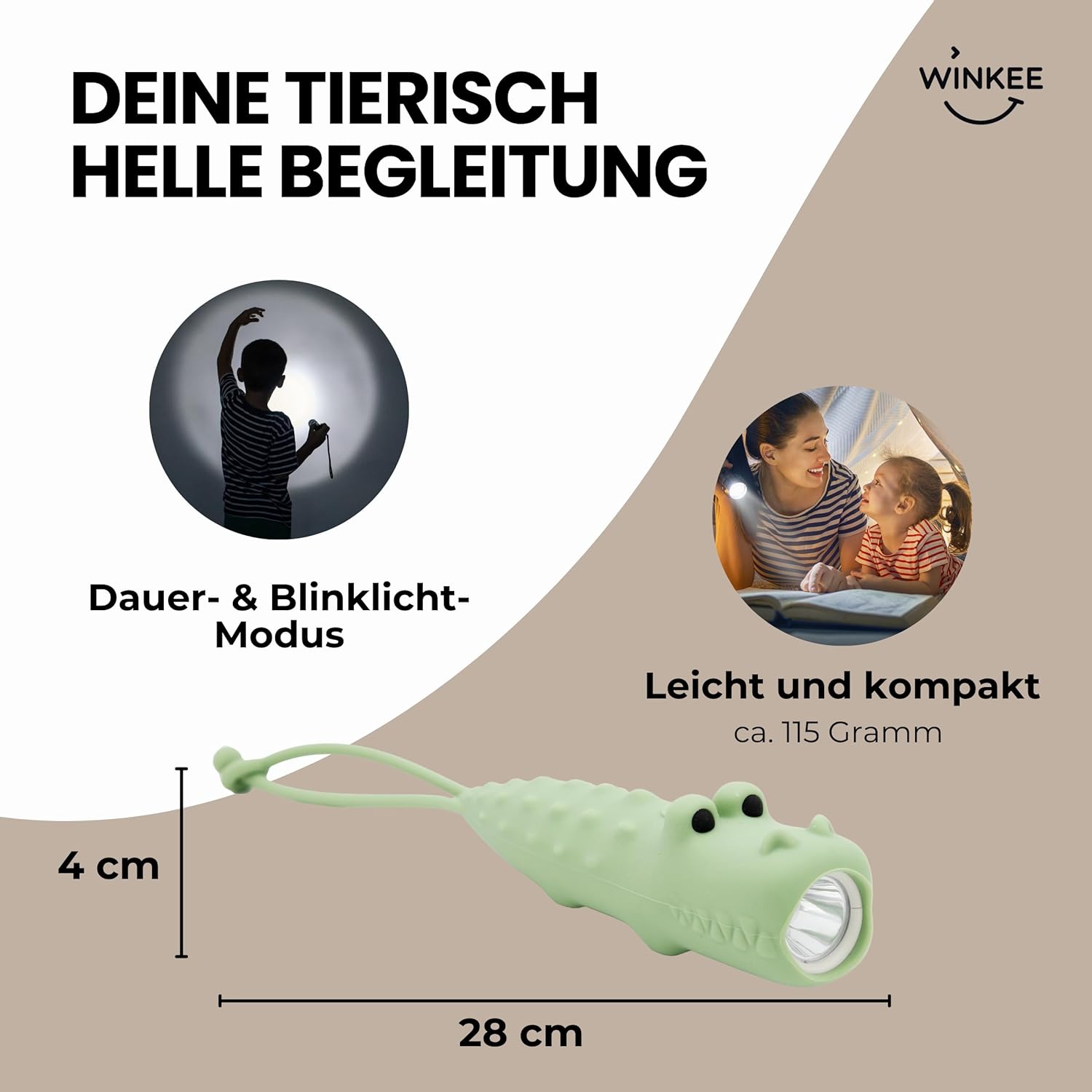 Product description : Discover the Winkee Kroko flashlight, your reliable light source for every night adventure. This attractive and practical LED flashlight is not only a useful tool, but also attracts attention with its adorable crocodile design. With a size of 19.5 x 6 x 6 cm and made of durable silicone, this flashlight is perfect for use anywhere, whether camping, night walks or travel. Features and Benefits: Two lighting modes: choose between a steady light and a flashing light for emergencies. Long battery life: up to 12 hours of reliable light on a single battery charge. PORTABLE & FLEXIBLE - Easy to attach to backpacks or equipment for hands-free use. Easy to clean and durable: easy to clean and durable, ideal for outdoor activities. PERFECT GIFT Surprise a loved one with this cute and functional flashlight, perfect for kids and anyone who loves going outdoors. IDEAL FOR ANY OCCASION Whether you need a convenient light for a night walk or looking for a reliable light source for your camping trips, the Winkee Kroko Flashlight is ready to accompany you every step. See how this small but powerful tool changes your nighttime experience